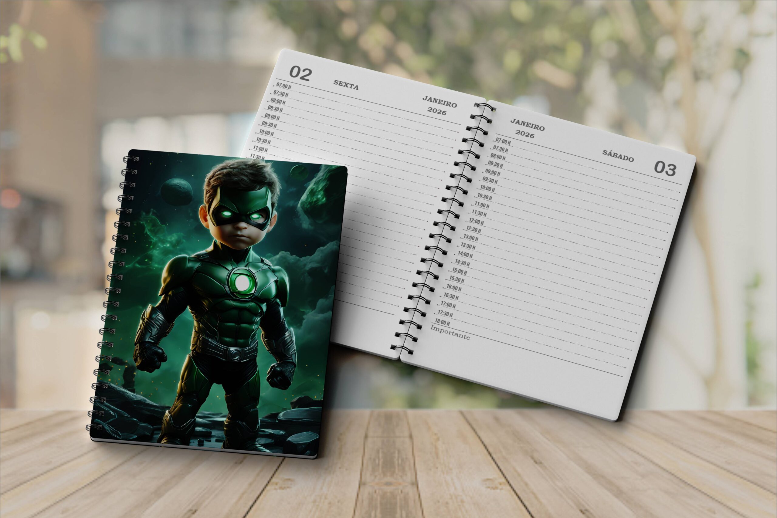Miolo de Agenda 2026 para Imprimir Diária Cinza com Horas – Brinde Capa Lanterna Verde Menino